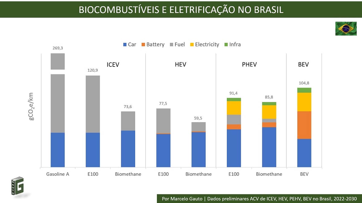 Já um BEV, 100% elétrico a bateria, segundo o estudo levando em conta seu ciclo de vida emite 104,8 gCO2e/km quando alimentado pela matriz energética brasileira, mais de 80% dela renovável. Ainda assim o resultado é pior do que qualquer híbrido combinado com etanol ou biometano ou mesmo um veículo a combustão abastecido só com biometano.