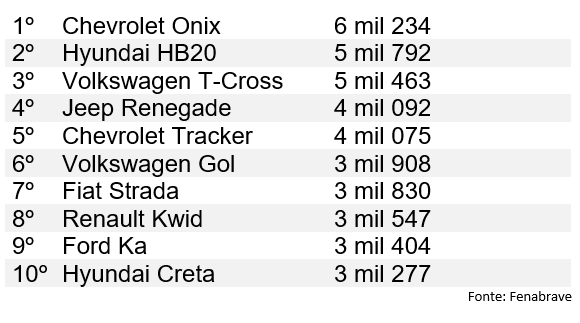 Além do T-Cross dentre os dez mais vendidos aparecem os SUVs Jeep Renegade, quarto do ranking geral, Chevrolet Tracker, quinto mais vendido, e Hyundai Creta, décimo do ranking. Outro SUV, o Jeep Compass, ficou na décima-primeira posição.