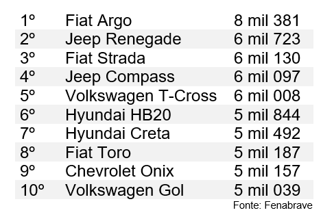 O ranking dos dez mais vendidos tem quatro hatches, Fiat Argo, Hyundai HB20, Chevrolet Onix e Volkswagen Gol, quatro SUVs, Jeep Renegade e Compass, VW T-Cross e Hyundai Creta, e duas picapes, as Fiat Strada e Toro.