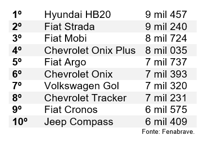 O Fiat Mobi completou o pódio do mês, com 8,7 mil unidades comercializadas.