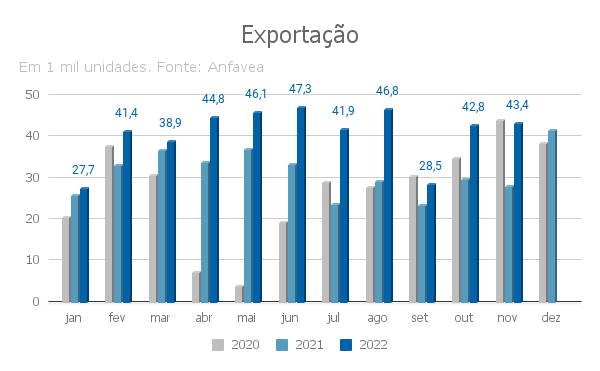 No nono mês de 2022, diante de problema de atrasos de três navios, que não navegaram na data prevista, houve maior concentração em outubro, tanto que em setembro as exportações somaram 29 mil unidades e no décimo mês 43 mil. Ou seja: o resultado de novembro se equiparou a uma base de comparação elevada.
