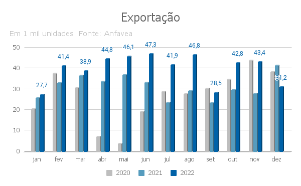 Em valores as exportações de veículos em 2022 somaram US$ 10,4 bilhões, expansão de 37,6% na comparação com 2021.