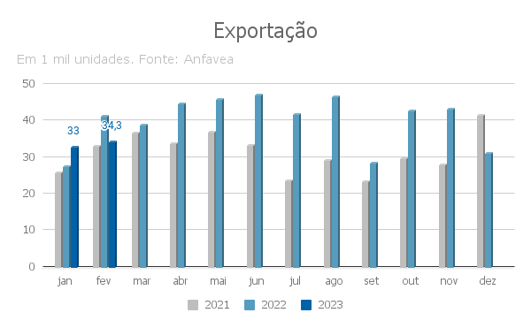 Na comparação com janeiro, quando 33 mil unidades foram exportadas, houve acréscimo de 3,8%. Na soma do bimestre, porém, os 67,4 mil veículos ficaram 2,6% aquém do volume dos dois primeiros meses do ano passado, 69,2 mil unidades.
