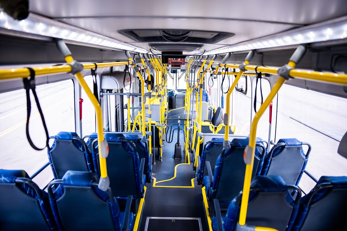 Interior do Attivi: carroceria padron de 13 metros com capacidade para 80 a 90 passageiros.