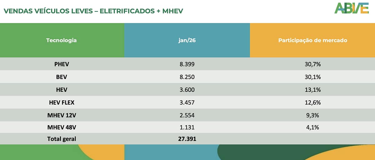 Os 27,4 mil eletrificados vendidos em janeiro representam fatia de quase 17% do mercado de veículos leves emplacados no mês passado, de 161,8 mil unidades. Para o presidente da ABVE, Ricardo Bastos, o bom desempenho dos eletrificados reflete o amadurecimento do ecossistema da eletromobilidade no País.