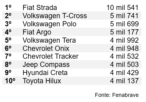 Os SUVs dominaram o ranking do primeiro mês do ano. Além de T-Cross e Tera a Chevrolet Tracker, sétimo mais vendido, o Jeep Compass, oitavo, e o Hyundai Creta, nono, estão no Top 10 – cinco de dez. Os hatches foram três: Polo, Argo e o Chevrolet Onix.