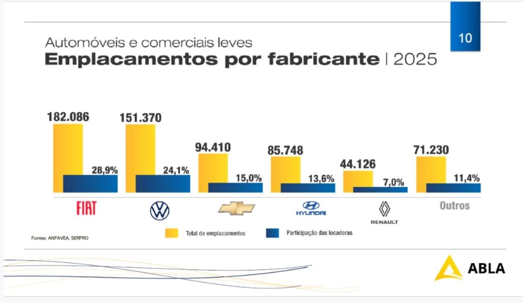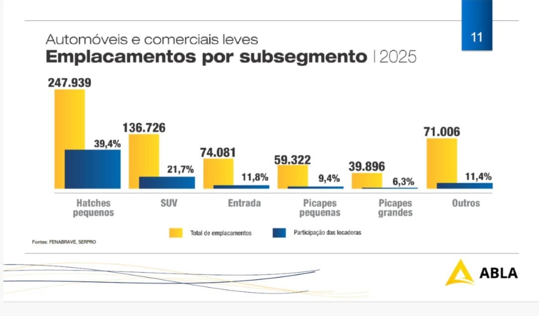 Os 629 mil carros adquiridos por locadoras em 2025 representaram 24,6% do total de 2,5 milhões emplacados no País – no ano anterior a fatia foi de 26,1% de 2,4 milhões e, historicamente, a média é de 25%, conforme os números da Abla.