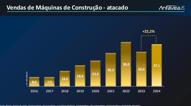 No caso das máquinas dedicadas à construção foram comercializadas no ano passado 37,1 mil unidades, 22,2% acima do volume de 2023. O número se aproximou do recorde de 39 mil equipamentos vendidos em 2022. A maior parte desta quantidade foi direcionada para o setor de construção civil, que ampliou suas compras de 37% para 42% em um ano. Do restante 23% foram para locação e 17% para agrícola e florestal.