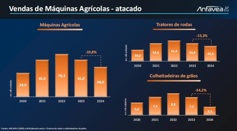 Os dados, divulgados pela Anfavea na quinta-feira, 23, segregados, apontam que a quebra da safra provocada por mudanças climáticas como as enchentes que assolaram o Rio Grande do Sul em maio, a queda nos preços das commodities gerada pelo estoque elevado, principalmente de soja, e elevadas taxas de juros retraíram as vendas de máquinas agrícolas em 19,8%.