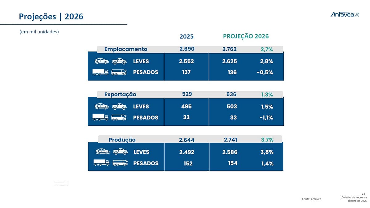 Estes dados já incluem números de produção de BYD e GWM, cálculo de 69 mil unidades segundo a entidade, somados os volumes esperados para as duas empresas. A produção de ambas não entraram no balanço de 2025, mas, segundo Calvet, tratou-se de volume baixo.