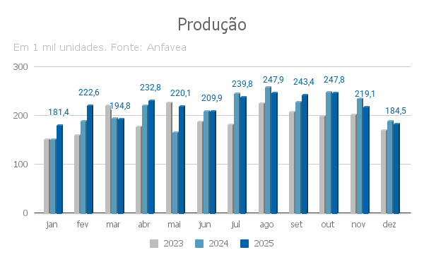 Em agosto, projetando 2025, as expectativas da Anfavea eram de 2 milhões 749 mil veículos produzidos, 2 milhões 765 mil vendidos e 552 mil exportados.